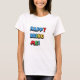 "Lycklig som är jag" vit t-shirt med ljust regnbåge-färgad brev, ha roligt som du.