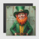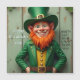 Ett leprechaun i traditionell grönt med ett stort leende sprider bra cheer. Den rustiska träväggen i bakgrunden, som är dekorerad med schampar och ett uppriktigt irländskt ordspråk, ger motivet en festlig och charmerande atmosfär. Perfekt för St. Patrick's Day hälsning och dekorationer.