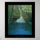 Lycklig Ställe - ett lejont bergsområde ljuger delvis dolt i en smal bäcken bredvid ett vattenfall. Mjuka gröntar av vegetationskontrasten vid bergstrakter med levande blåsor från ett osynt himlar som reflekteras i vattenfallet bassäng. Från en akrylmålning av M Rogers.