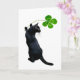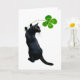 En svart katt håller upp en grön fyrklöver. Önska någon lycka med detta irländska kattkort på St. Patrick's Day.