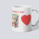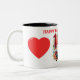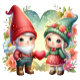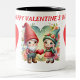 Bilden visar ett vitt keramiskt mugg med ett svart insida. Mugg har en färgstark Alla hjärtans dag-design med två gnomer som håller ett hjärta mellan dem. Gomen på den lämnat har en röd hatt och blått byxor, medan gnomen på högerna har en grönt hatt och klänning på sig. Bakom gnomerna finns ett stort hjärta i grönten med blommigtens dekorationer. Texten "HAPPY VALENTINS DAY" står skriven i rött överst i mugg.