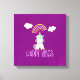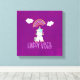 Ett kanvastryck med ett med ett vackert teckning av en sitta i fantastisk på dess rumpa och i lycklig. Ljusfluffa moln och en färgstark regnbåge ovan. Texten säger: Lycklig Vibes. Fantastisk positivitet. Ställ in på en rosa vattenfärgsbakgrund för lila.
