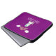 Ett laptop sleeve med en söt illustration av en vit enhörning av sitta på dess gungande leende och tittar lycklig. Lekande moln och regnbåge. Texten säger: Lycklig Vibes. En bra upplyftande bild. Med en rosa lila vattenfärgsbakgrund.