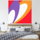 Lycklig Vingar. Den här färgstarka, roligt och dynamiska designen har en lila och en orange stor vit, framträdande oval som sveper diagonalt över designen och skapar en känsla av dynamisk rörelse på arbetsytan. Det finns en vit ovalform inuti varje del som ger en skuggad dimension till konsten. Generöst böjt linjer flödar i den sammansättning där formen möter den ljusröda bakgrunden i två hörn.