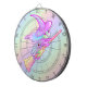 Min teckning av en lycklig-häxa som flyger på en pjäs. Hon har en rosa lila hatt och klänning, grönt och orange strippade baljor, grönt och långblått hår.