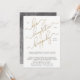 Denna vackra, moderna svarta, vita och gyllene bröllopsinbjudan efter vigseln "Happily Ever After" har ett förgyllt blad kalligrafi-skrift som läser 'Till Kärlek, Latter, och Happily Ever After' som huvudsaklig designelement. Designen är personifierad med ert bröllops tillkännagivande nedan, och följs av detaljer om inbjudan till efterfesten nedan. Designen är vacker kompletterad med det moderna, svarta, versala sans serif-teckensnittet på den krispiga, vita bakgrunden, som tillkännager datum och plats för efterfesten. Baksidan av inbjudan har en modern svart och vit akvarell konst för att fullborda den sofistikerade designen.