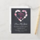 Ett magiskt tema för ett spara-datum bröllopspåminnelse vykort. Designat med en romantisk illustration av en massa små rosa glittrande hjärtan som formar en hjärtformad ram. Inuti står det "Lyckliga För Evigt" i en trendig handskriven teckensnittsstil. Satt på en svart tavla bakgrund. Personifiera med dina bröllopsdetaljer på framsida och baksida.