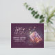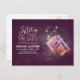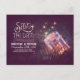 Speciell och lila save the date postkort med vacker fantasifull murbrukburk med glödande ljus - lysmaskar. Modern men vintage save the date perfekt för rustika landsbröllopsteman.