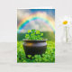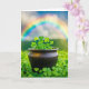 Gröna fyrbladiga klövrar i en gammal svart vattenkittel i ett klöverfält med en regnbåge