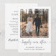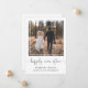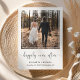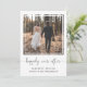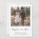 Enkel och chic vigsel eller mindre bröllopsannons och inbjudan till efterfest eller fest. Framsidan visar ditt fotografi i en utskuren fyrkantig ram, "lyckliga för alltid" skrivet i ett trendigt skrivstil med svängar och dina förnamn och bröllopsdatum och plats i modern typografi. På baksidan kan du anpassa din bröllopsannons och inbjudan till mottagning och lägga till dina efternamn i en signaturliknande skrift.