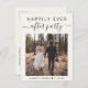 Modern bröllopshändelse eller privat vigselanmälan i ljust krämfärg i kombination med en inbjudan till bröllopsfest. Framsidan visar er bröllopsdagsfoto och "Happily Ever After Party" i en mix av enkel typografi och ett stilrent skrivsätt med svängiga flourisher. Under er bild kan ni lägga till er förnamn och bröllopsdatum. På baksidan kan ni anpassa er hälsning och er inbjudan mer i detalj, mata in er bröllopswebbadress för att skapa en QR-kod som era gäster kan skanna för att få mer information och svara på inbjudan online, och lägga till era namn i ett signaturliknande skrivsätt.