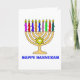 En ljus Hannukah menora med ord lyckliga Hannukah välkomnar helgdag. Lyckligt äta för latke!