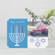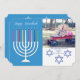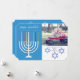 En vitmenora med färgrika stearinljus och en lyckligHanukkah känsla paras med tre hängande stjärnor av David för att skapa detta glatt helgdagkort. Tillfoga precis ditt foto för att göra det din. Vecteezy judiska ljusstakar.