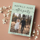 Modern grönt-utsändning eller mindre bröllop-utlysning och mottagningsinbjudan för att informera familj och vänner om att du var gift vid en liten ceremoni i bröllop och nu till inbjudan till ett bröllopsmottagning. Framsidan har ditt bröllopsdag-foto och "Lyckligtvis allt efter Party" i en blandning av enkel typografi och trendig-skript med dekorationer. Lägg till ditt första datum namn och bröllop under fotot. På motsatt sida kan du anpassa ditt meddelande mer i detalj och lägga till information om party eller mottagningsinbjudan och namn i ett namnteckning skript.