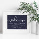 Välkomna gäster till bröllop med vår söta chic poster, tillgängliga i flera storlekar. Designen har vit typografi på ditt val av bakgrund färg med välkommen längst upp i elegantens handskrivna kalligrafiskript och "...till vår lyckliga dag efter" och din namn och bröllop dejt under. Visas i rik 24:e marinblått.
