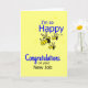 Lyckönskan på ett nytt jobb med texten mig förmiddag så lycklig för dig i blått och svart med 3 tecknadbi och gultbakgrund.