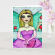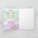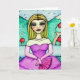 Gratulationskort vacker illustration gjord i blandad teknik av en vacker blond flicka och kvinna, sittande mitt i ett naturligt fantasilandskap. Klädd i elegant violett klänning, med handskar i samma färg och en fläkt i handen.