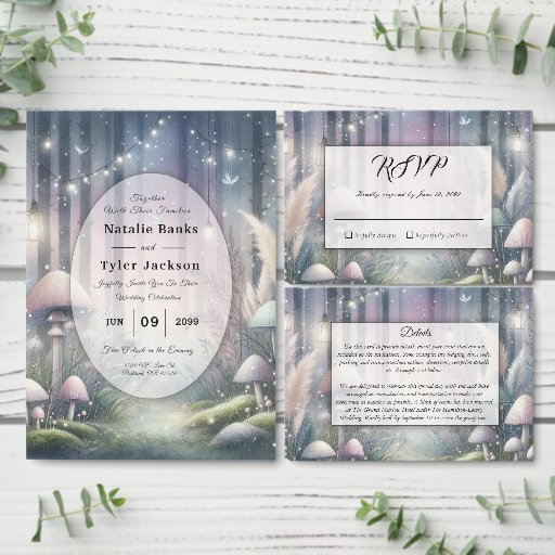 Bjud in dina gäster till en magisk kväll under lysande lyktor med denna drömska bröllopsinbjudan design. Placerad i en pastellskog fylld med mjukt lysande svampar, fladdrande fjärilar och gnistrande ljus, är denna förtrollande scen perfekt för en romantisk fest full av under. Dimmiga nyanser av rosafärgat, lavendel och mjukt teal skapar en sagolik atmosfär för din mest oförglömliga stund.
