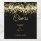 Cheers Svart och Guld Lyxig Vin Etikett Stilfull lyxig etikett för mousserande vin, exekverad på svart bakgrund med glittrande gyllene paljetter och ett positivt önskande i guld-ockra färg är idealisk för att dekorera en lyxig bröllop. Lätt att anpassa.