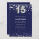 En modern, snyggt och glamorös inbjudan till en Quinceañera, 15:e födelsedagsfesten. En marin blå bakgrund, dekorerad med faux silver-stjärnor. Anpassa och lägg till ditt namn och information om party. Nummer 15 skrivs med ett stil-teckensnitt med ballong.