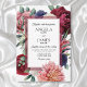 Denna lyxiga inbjudan visar upp ett rikt sortiment av blommande blommor i saftiga nyanser av burgunderrött, rosafärgat och marinblått, sammanflätade med en touch av grönska. En lätt genomskinlig ram omger den moderna typografiska layouten mot en krispigt vit bakgrund. Ett vackert val för höst- eller vintersammankomster och även för glamourösa vingårdsbröllop när som helst på året. Detta är en del av en vacker brölloppsserie med många matchande delar.
