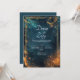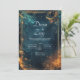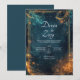 Transponera dina gäster till en kväll av kosmisk lyx med denna verkligt fängslande himmelska bröllopsinbjudan. Hela designen är byggd på en rik, kant-till-kant bakgrund av djup midnattsblå och teal nebulosmoln, vilket ger intrycket av att titta genom rymden in i ett avlägset stjärnlandskap. Det centrala området är en djup, mörk vidd översållad med otaliga gnistrande vita stjärnor och ljusa bokeh-effekter. Denna fantastiska kosmiska vy ramas in av en invecklad och överdådig kant av skimrande falskt guld i barock stil med sirliga rullar och ömtåliga vinrankor, som tycks lysa med ett eldigt orange-gul ljus. Hörnen har dramatiska puffar av teal rök som smälter samman med mörkret och ytterligare förstärker djupet och mystiken i designen. Denna lyxiga, fantasifulla stil är perfekt för par som planerar ett elegant bröllop på kvällen, en maskeradbal eller någon annan tillställning som betonar kosmisk skönhet, dramatisk lyx och en verkligt oförglömlig estetik. Denna design är perfekt för himmelska bröllopsinbjudningar,