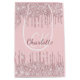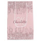 En bakgrund i rosablush med falska glitterdroppar och en look som om färgen droppade. Personifiera med ett namn och initialer i monogram. Namnet skrivs med en trendig handskriven stilsnack. Kan användas både som presentförpackning och som förmånspåse för födelsedagar, bröllopsdusch och baby shower.