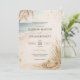 En elegant strandbröllopsinbjudan med mjuka havsvågor, palmdetaljer och varma gyllene accenter. Perfekt för bröllop vid havet, destination eller sommar. Designad i ett klassiskt 5×7-format med en matchande layout för framsida och baksida.