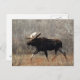 Bull Moose Postcard. En stor bull gräver upp knölar genom buskborsten i ett sandområde i backe i sydöstra Alberta, Kanada. Moose verkar komma ut ur ställe i detta torra, sanna terräng som har mycket lite vatten för att stödja den vattenlevande vegetation som älgen vanligtvis matar på.