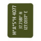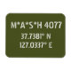 Latitud- och longitud-karta-koordinaterna för det fiktiva sjukhuset M*A*S*H* 4077 fält, som enligt uppgift låg nära staden Uijeongbu i Sydkorea. Stencil stil, vitt teckensnitt på gröntens bakgrund i armén.