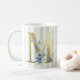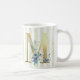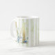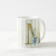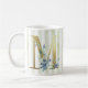 Brev M, gyllene inledning med blå vattenfärgsblad på blått och vitt rand mugg. © Julie McIver