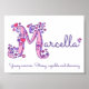 Vacker M-monogram konstnärlig namnskylt perfekt för ett flickors sovrum eller lekrum i nyanser av vitt, rosa och lila. Personifiera med ditt barns eget namn som börjar med M, och namnbetyder för en verkligt personlig touch i ditt barns sovrum eller barnkammare, detta exempel är för namnet Marcella Ung krigare. Stark, kapabel och fantastisk. Söt posterskrivning idealisk för ett flickors sovrum eller som en present till en ny bebis, dop eller baby shower-gåva. unik bokstav M monogram hjärtan och blommor ritning beskrivning och grafisk konst design av Sarah Trett. www.sarahtrett.com för www.mylittleeden.com
