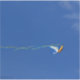 Ett foto av en färglös lakakit med rosett band som flyter i vinden från vingar och som flyger högt under sommaren blå himmel. Copyright ©Kimberly J Tilley.