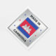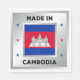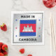 The national flag of Cambodia is central to the design. There are decorative stars on either side of the flag, and they are in the colours of the Cambodian flag. The design is completed by a faux silver background.