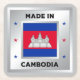 The national flag of Cambodia is central to the design. There are decorative stars on either side of the flag, and they are in the colours of the Cambodian flag. The design is completed by a faux silver background.