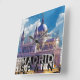 Souvenir visar en ikonisk bild av Palacio Real och Catedral de la Almudena i Madrid, Spanien.
