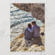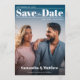 A modern wedding Save the Date that looks like a magazine cover. It has a pair of lovers at the sea, looking at each other, with the blue sky in the background. In the upper part, the title Save the Date is written in big bold fonts (except the word "the", that is in script, between two lines. Above the title and the first line, to the left, there is the date; under the title and the second line, to the right, there is the place. In the lower part, their names are written in bold fonts, with the message "Formal invitation to follow" in smaller white fonts under it. All text is white. There are gradients over the photo, both in the upper and lower part, to make the white text more visible.