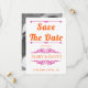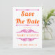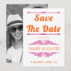 Vintage inslag och pulserande orange- och magentans typografi av rosan bröllop spara datum. Med den här elegant bröllop-designen visningar du texten "Spara datumet" i fet stil och inslag vintage som utgör ramar för texten. Baksidan har ett foto av paret.