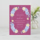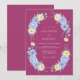 Denna design har en rik magenta bakgrund prydd med ett blomsterarrangemang av blekblå och krämfärgade rosor. Ömtåliga lavendelfärgade kvistar och små blå bär tillför en touch av nyckfullhet till akvarellkompositionen. Den livfulla färgpaletten skapar en djärv och romantisk stämning, perfekt för ett konstnärligt sommar- eller vårfirande.
