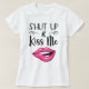 Det här trendiget kysser mig t-shirt med teckning på ett par magenta läppstift läppar och bildtexten Håll käften & Kiss Me i ett svart modernt typsnitt.