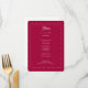 Det här återinspirerade och fetstilta menykortet i rundad form har en ram-påfyllnadsteckensnitt, ett skript och en middagsmeny eller en bröllop-meny på fetstilt rosa fuchsia-bakgrund. Perfekt för ett modernt bröllop eller någon annan elegant händelse. På baksidan finns plats för datumet namn och bröllop - eller ta helt enkelt bort texten på baksidan. Hela färger på det här bröllop-menykortet - bakgrund, text och påfyllnad i ram färg - kan ändras i verktyg. Menykortet magenta bröllop ingår i en samling bröllop med fler matchande objekt.