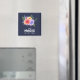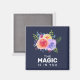 En magnet med inspirationstexten: Magin finns i dig. Designad med en fin bukett av vattenfärgen ro med sprit, löv och grenar tillsammans i en färglös blommigt arrangemang. Blåblå bakgrund.
