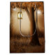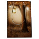 Giftpåse med en vismisk antydande illustration i rik brun och gult färg. En magisk mystisk skog med ett stort träd som håller ett gammaldags lternt. Fairy ljus dansar överallt. En fantastisk design.