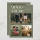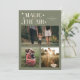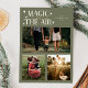 Elegant holiday card featuring a text that says "magic in the air" with 3 photos on the front. Add another photo on the back along with your message. Background is sage green.