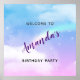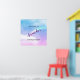 Välkomstfödelsedag poster med en mjuk och underbar bakgrundsbild. Pastellkritor och rosa moln med magisk regnbåge.