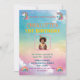 Det här är en enbarkad födelsedagsinbjudan för ett barn på första färgaden. Den har en vit bakgrund med mjuka regnbåge, enmajsbilder och ett centrerat foto av födelsedagsbarnet. Texten innehåller händelseinformation som datum, tid, plats och OSA. Perfekt för en magisk och roligt firande. Anpassa för personlig beröring!