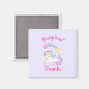 Ett tack till er magnet med en vacker vit enhörn med pastellpräglat grönt, lila, gult och rosa. Denna magiska varelse sover fredligt med en färgad som skjuter stjärna som flyger över hennes huvud. I texten står "Magic Tack" i ett teckensnitt för rosa trendig. Pastellbakgrund för lila.