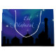 Eid hälsningillustration med en magical aftonhimmelplats: silhouette av en moské på en blåttnatthimmel med skins stjärnor och månen.
