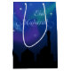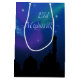 Eid hälsningillustration med en magical aftonhimmelplats: silhouette av en moské på en blåttnatthimmel med skins stjärnor.