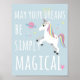 Denna söta och magiska barn eller bebis-plakat har en vacker enhörning, planet, prinsesskrona och hjärta-illustration, med en enkel blå bakgrund. Plakaten har också orden 'Må dina drömmar vara enkelt magiska' i elegant typografi. Den perfekta nyckfulla förtrollade dekorationen för din nyföddas barnrum eller barnkammare!